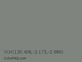 YUV 130.408,-2.173,-2.989 Color is a normal green color and the nearest color is Gray #808080. Hex code #7f857e and RGB value is rgb(127,133,126). In RGB color space, this color is composed of 50% red, 52% green, 49% blue, In CMYK color space, this color is composed of 5% cyan, 0% magenta, 5% yellow , 48% black , In HSL color space, this color has a hue angle of 111° , 3% saturation and 51% lightness.