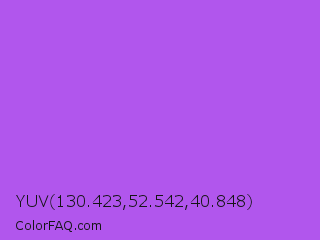 YUV 130.423,52.542,40.848 Color is a light purple color and the nearest color is Medium Orchid #ba55d3. Hex code #b156ed and RGB value is rgb(177,86,237). In RGB color space, this color is composed of 69% red, 34% green, 93% blue, In CMYK color space, this color is composed of 25% cyan, 64% magenta, 0% yellow , 7% black , In HSL color space, this color has a hue angle of 276° , 81% saturation and 63% lightness.