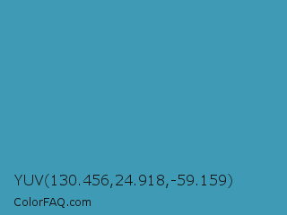 YUV 130.456,24.918,-59.159 Color is a normal cyan color and the nearest color is Boston Blue #3b91b4. Hex code #3f9bb5 and RGB value is rgb(63,155,181). In RGB color space, this color is composed of 25% red, 61% green, 71% blue, In CMYK color space, this color is composed of 65% cyan, 14% magenta, 0% yellow , 29% black , In HSL color space, this color has a hue angle of 193° , 48% saturation and 48% lightness.