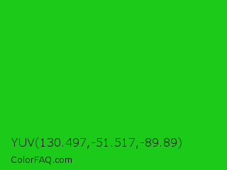 YUV 130.497,-51.517,-89.89 Color is a normal green color and the nearest color is Lime Green #32cd32. Hex code #1ccb1a and RGB value is rgb(28,203,26). In RGB color space, this color is composed of 11% red, 80% green, 10% blue, In CMYK color space, this color is composed of 86% cyan, 0% magenta, 87% yellow , 20% black , In HSL color space, this color has a hue angle of 119° , 77% saturation and 45% lightness.