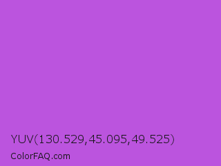 YUV 130.529,45.095,49.525 Color is a normal purple color and the nearest color is Medium Orchid #ba55d3. Hex code #bb54de and RGB value is rgb(187,84,222). In RGB color space, this color is composed of 73% red, 33% green, 87% blue, In CMYK color space, this color is composed of 16% cyan, 62% magenta, 0% yellow , 13% black , In HSL color space, this color has a hue angle of 285° , 68% saturation and 60% lightness.