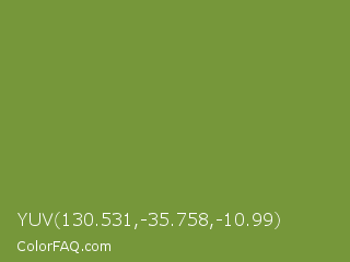 YUV 130.531,-35.758,-10.99 Color is a normal green color and the nearest color is Palm Leaf #6f9940. Hex code #76973a and RGB value is rgb(118,151,58). In RGB color space, this color is composed of 46% red, 59% green, 23% blue, In CMYK color space, this color is composed of 22% cyan, 0% magenta, 62% yellow , 41% black , In HSL color space, this color has a hue angle of 81° , 44% saturation and 41% lightness.