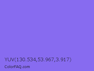 YUV 130.534,53.967,3.917 Color is a light indigo color and the nearest color is Medium Slate Blue #7b68ee. Hex code #876bf0 and RGB value is rgb(135,107,240). In RGB color space, this color is composed of 53% red, 42% green, 94% blue, In CMYK color space, this color is composed of 44% cyan, 55% magenta, 0% yellow , 6% black , In HSL color space, this color has a hue angle of 253° , 82% saturation and 68% lightness.