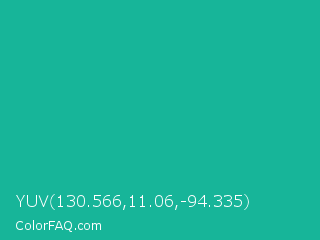 YUV 130.566,11.06,-94.335 Color is a normal cyan color and the nearest color is Light Sea Green #20b2aa. Hex code #17b599 and RGB value is rgb(23,181,153). In RGB color space, this color is composed of 9% red, 71% green, 60% blue, In CMYK color space, this color is composed of 87% cyan, 0% magenta, 15% yellow , 29% black , In HSL color space, this color has a hue angle of 169° , 77% saturation and 40% lightness.