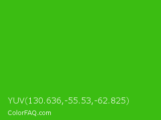YUV 130.636,-55.53,-62.825 Color is a normal green color and the nearest color is Kelly Green #4cbb17. Hex code #3bbd12 and RGB value is rgb(59,189,18). In RGB color space, this color is composed of 23% red, 74% green, 7% blue, In CMYK color space, this color is composed of 69% cyan, 0% magenta, 90% yellow , 26% black , In HSL color space, this color has a hue angle of 106° , 83% saturation and 41% lightness.