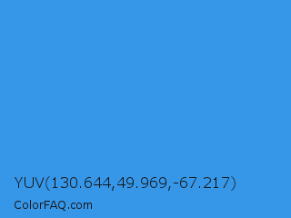 YUV 130.644,49.969,-67.217 Color is a normal blue color and the nearest color is Bleu De France #318ce7. Hex code #3696e8 and RGB value is rgb(54,150,232). In RGB color space, this color is composed of 21% red, 59% green, 91% blue, In CMYK color space, this color is composed of 77% cyan, 35% magenta, 0% yellow , 9% black , In HSL color space, this color has a hue angle of 208° , 79% saturation and 56% lightness.