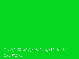 YUV 130.647,-49.126,-110.192 Color is a normal green color and the nearest color is Vivid Malachite #00cc33. Hex code #05d61f and RGB value is rgb(5,214,31). In RGB color space, this color is composed of 2% red, 84% green, 12% blue, In CMYK color space, this color is composed of 98% cyan, 0% magenta, 86% yellow , 16% black , In HSL color space, this color has a hue angle of 127° , 95% saturation and 43% lightness.