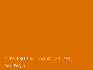 YUV 130.649,-64.41,79.238 Color is a normal orange color and the nearest color is Mango Tango Crayola #e77200. Hex code #dd6e00 and RGB value is rgb(221,110,-0). In RGB color space, this color is composed of 87% red, 43% green, 0% blue, In CMYK color space, this color is composed of 0% cyan, 50% magenta, 100% yellow , 13% black , In HSL color space, this color has a hue angle of 30° , 100% saturation and 43% lightness.
