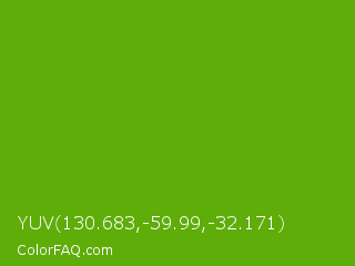 YUV 130.683,-59.99,-32.171 Color is a normal green color and the nearest color is Christi #67a712. Hex code #5ead09 and RGB value is rgb(94,173,9). In RGB color space, this color is composed of 37% red, 68% green, 4% blue, In CMYK color space, this color is composed of 46% cyan, 0% magenta, 95% yellow , 32% black , In HSL color space, this color has a hue angle of 89° , 90% saturation and 36% lightness.