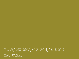 YUV 130.687,-42.244,16.061 Color is a normal yellow color and the nearest color is Sycamore #908d39. Hex code #958a2d and RGB value is rgb(149,138,45). In RGB color space, this color is composed of 58% red, 54% green, 18% blue, In CMYK color space, this color is composed of 0% cyan, 7% magenta, 70% yellow , 42% black , In HSL color space, this color has a hue angle of 54° , 54% saturation and 38% lightness.