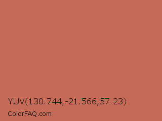 YUV 130.744,-21.566,57.23 Color is a normal red color and the nearest color is Copper Red #cb6d51. Hex code #c46a57 and RGB value is rgb(196,106,87). In RGB color space, this color is composed of 77% red, 42% green, 34% blue, In CMYK color space, this color is composed of 0% cyan, 46% magenta, 56% yellow , 23% black , In HSL color space, this color has a hue angle of 10° , 48% saturation and 55% lightness.
