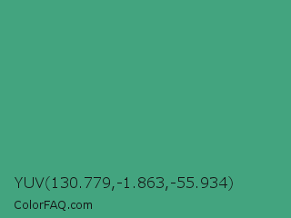 YUV 130.779,-1.863,-55.934 Color is a normal green color and the nearest color is Ocean Green #41aa78. Hex code #43a47f and RGB value is rgb(67,164,127). In RGB color space, this color is composed of 26% red, 64% green, 50% blue, In CMYK color space, this color is composed of 59% cyan, 0% magenta, 23% yellow , 36% black , In HSL color space, this color has a hue angle of 157° , 42% saturation and 45% lightness.