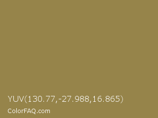 YUV 130.77,-27.988,16.865 Color is a normal yellow color and the nearest color is Dark Tan #918151. Hex code #96844a and RGB value is rgb(150,132,74). In RGB color space, this color is composed of 59% red, 52% green, 29% blue, In CMYK color space, this color is composed of 0% cyan, 12% magenta, 51% yellow , 41% black , In HSL color space, this color has a hue angle of 46° , 34% saturation and 44% lightness.