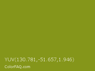 YUV 130.781,-51.657,1.946 Color is a normal yellow color and the nearest color is Trendy Green #7c881a. Hex code #85961a and RGB value is rgb(133,150,26). In RGB color space, this color is composed of 52% red, 59% green, 10% blue, In CMYK color space, this color is composed of 11% cyan, 0% magenta, 83% yellow , 41% black , In HSL color space, this color has a hue angle of 68° , 70% saturation and 35% lightness.