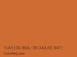 YUV 130.804,-39.343,65.947 Color is a normal orange color and the nearest color is Medium Vermilion #d9603b. Hex code #ce6c33 and RGB value is rgb(206,108,51). In RGB color space, this color is composed of 81% red, 42% green, 20% blue, In CMYK color space, this color is composed of 0% cyan, 48% magenta, 75% yellow , 19% black , In HSL color space, this color has a hue angle of 22° , 61% saturation and 50% lightness.