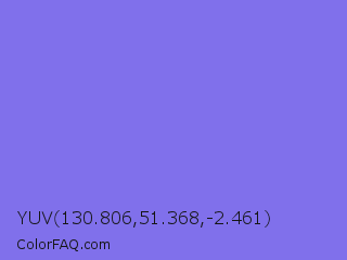 YUV 130.806,51.368,-2.461 Color is a light indigo color and the nearest color is Medium Slate Blue #7b68ee. Hex code #8070eb and RGB value is rgb(128,112,235). In RGB color space, this color is composed of 50% red, 44% green, 92% blue, In CMYK color space, this color is composed of 46% cyan, 52% magenta, 0% yellow , 8% black , In HSL color space, this color has a hue angle of 248° , 75% saturation and 68% lightness.