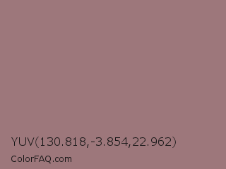 YUV 130.818,-3.854,22.962 Color is a normal red color and the nearest color is Bazaar #98777b. Hex code #9d777b and RGB value is rgb(157,119,123). In RGB color space, this color is composed of 62% red, 47% green, 48% blue, In CMYK color space, this color is composed of 0% cyan, 24% magenta, 22% yellow , 38% black , In HSL color space, this color has a hue angle of 354° , 16% saturation and 54% lightness.
