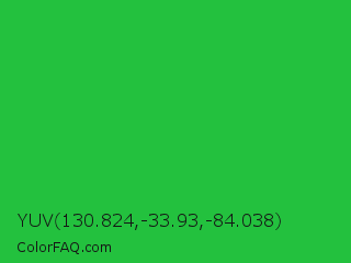 YUV 130.824,-33.93,-84.038 Color is a normal green color and the nearest color is Lime Green #32cd32. Hex code #23c13e and RGB value is rgb(35,193,62). In RGB color space, this color is composed of 14% red, 76% green, 24% blue, In CMYK color space, this color is composed of 82% cyan, 0% magenta, 68% yellow , 24% black , In HSL color space, this color has a hue angle of 130° , 69% saturation and 45% lightness.