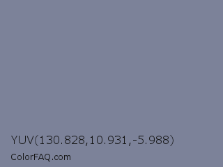 YUV 130.828,10.931,-5.988 Color is a normal blue color and the nearest color is Light Slate Gray #778899. Hex code #7c8299 and RGB value is rgb(124,130,153). In RGB color space, this color is composed of 49% red, 51% green, 60% blue, In CMYK color space, this color is composed of 19% cyan, 15% magenta, 0% yellow , 40% black , In HSL color space, this color has a hue angle of 228° , 12% saturation and 54% lightness.