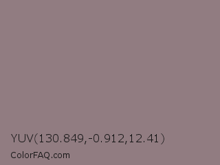 YUV 130.849,-0.912,12.41 Color is a normal red color and the nearest color is Rocket Metallic #8a7f80. Hex code #917c81 and RGB value is rgb(145,124,129). In RGB color space, this color is composed of 57% red, 49% green, 51% blue, In CMYK color space, this color is composed of 0% cyan, 14% magenta, 11% yellow , 43% black , In HSL color space, this color has a hue angle of 346° , 9% saturation and 53% lightness.