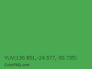 YUV 130.851,-24.577,-50.735 Color is a normal green color and the nearest color is Chateau Green #40a860. Hex code #49aa51 and RGB value is rgb(73,170,81). In RGB color space, this color is composed of 29% red, 67% green, 32% blue, In CMYK color space, this color is composed of 57% cyan, 0% magenta, 52% yellow , 33% black , In HSL color space, this color has a hue angle of 125° , 40% saturation and 48% lightness.