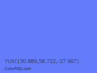 YUV 130.889,58.722,-27.967 Color is a light blue color and the nearest color is Blueberry #4f86f7. Hex code #637cfa and RGB value is rgb(99,124,250). In RGB color space, this color is composed of 39% red, 49% green, 98% blue, In CMYK color space, this color is composed of 60% cyan, 50% magenta, 0% yellow , 2% black , In HSL color space, this color has a hue angle of 230° , 94% saturation and 68% lightness.