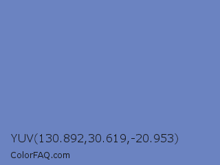 YUV 130.892,30.619,-20.953 Color is a normal blue color and the nearest color is Glaucous #6082b6. Hex code #6b83c1 and RGB value is rgb(107,131,193). In RGB color space, this color is composed of 42% red, 51% green, 76% blue, In CMYK color space, this color is composed of 45% cyan, 32% magenta, 0% yellow , 24% black , In HSL color space, this color has a hue angle of 223° , 41% saturation and 59% lightness.