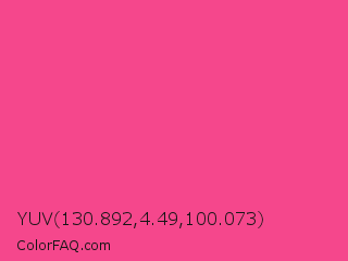 YUV 130.892,4.49,100.073 Color is a light rose color and the nearest color is Violet Red #f7468a. Hex code #f5478c and RGB value is rgb(245,71,140). In RGB color space, this color is composed of 96% red, 28% green, 55% blue, In CMYK color space, this color is composed of 0% cyan, 71% magenta, 43% yellow , 4% black , In HSL color space, this color has a hue angle of 336° , 90% saturation and 62% lightness.