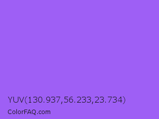 YUV 130.937,56.233,23.734 Color is a light violet color and the nearest color is Navy Purple #9457eb. Hex code #9e5ff5 and RGB value is rgb(158,95,245). In RGB color space, this color is composed of 62% red, 37% green, 96% blue, In CMYK color space, this color is composed of 36% cyan, 61% magenta, 0% yellow , 4% black , In HSL color space, this color has a hue angle of 265° , 88% saturation and 67% lightness.