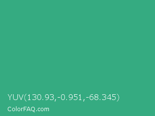 YUV 130.93,-0.951,-68.345 Color is a normal green color and the nearest color is Jungle Green #29ab87. Hex code #35ab81 and RGB value is rgb(53,171,129). In RGB color space, this color is composed of 21% red, 67% green, 51% blue, In CMYK color space, this color is composed of 69% cyan, 0% magenta, 25% yellow , 33% black , In HSL color space, this color has a hue angle of 159° , 53% saturation and 44% lightness.