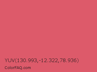 YUV 130.993,-12.322,78.936 Color is a light red color and the nearest color is Mandy #e25465. Hex code #dd5a6a and RGB value is rgb(221,90,106). In RGB color space, this color is composed of 87% red, 35% green, 42% blue, In CMYK color space, this color is composed of 0% cyan, 59% magenta, 52% yellow , 13% black , In HSL color space, this color has a hue angle of 353° , 66% saturation and 61% lightness.