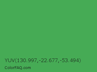 YUV 130.997,-22.677,-53.494 Color is a normal green color and the nearest color is Chateau Green #40a860. Hex code #46ab55 and RGB value is rgb(70,171,85). In RGB color space, this color is composed of 27% red, 67% green, 33% blue, In CMYK color space, this color is composed of 59% cyan, 0% magenta, 50% yellow , 33% black , In HSL color space, this color has a hue angle of 129° , 42% saturation and 47% lightness.