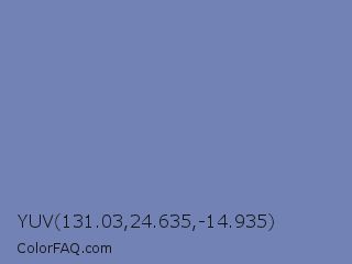 YUV 131.03,24.635,-14.935 Color is a normal blue color and the nearest color is Wild Blue Yonder #7a89b8. Hex code #7282b5 and RGB value is rgb(114,130,181). In RGB color space, this color is composed of 45% red, 51% green, 71% blue, In CMYK color space, this color is composed of 37% cyan, 28% magenta, 0% yellow , 29% black , In HSL color space, this color has a hue angle of 226° , 31% saturation and 58% lightness.