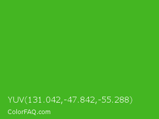 YUV 131.042,-47.842,-55.288 Color is a normal green color and the nearest color is Kelly Green #4cbb17. Hex code #44b622 and RGB value is rgb(68,182,34). In RGB color space, this color is composed of 27% red, 71% green, 13% blue, In CMYK color space, this color is composed of 63% cyan, 0% magenta, 81% yellow , 29% black , In HSL color space, this color has a hue angle of 106° , 69% saturation and 42% lightness.