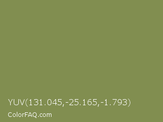 YUV 131.045,-25.165,-1.793 Color is a normal lime color and the nearest color is Moss Green #8a9a5b. Hex code #818e50 and RGB value is rgb(129,142,80). In RGB color space, this color is composed of 51% red, 56% green, 31% blue, In CMYK color space, this color is composed of 9% cyan, 0% magenta, 44% yellow , 44% black , In HSL color space, this color has a hue angle of 73° , 28% saturation and 44% lightness.