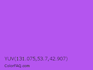 YUV 131.075,53.7,42.907 Color is a light purple color and the nearest color is Medium Orchid #ba55d3. Hex code #b455f0 and RGB value is rgb(180,85,240). In RGB color space, this color is composed of 71% red, 33% green, 94% blue, In CMYK color space, this color is composed of 25% cyan, 65% magenta, 0% yellow , 6% black , In HSL color space, this color has a hue angle of 277° , 84% saturation and 64% lightness.