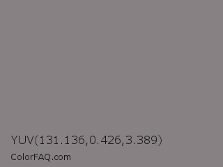 YUV 131.136,0.426,3.389 Color is a normal rose color and the nearest color is Suva Gray #888387. Hex code #878184 and RGB value is rgb(135,129,132). In RGB color space, this color is composed of 53% red, 51% green, 52% blue, In CMYK color space, this color is composed of 0% cyan, 4% magenta, 2% yellow , 47% black , In HSL color space, this color has a hue angle of 330° , 2% saturation and 52% lightness.