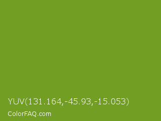 YUV 131.164,-45.93,-15.053 Color is a normal green color and the nearest color is Olive Drab #6b8e23. Hex code #729e26 and RGB value is rgb(114,158,38). In RGB color space, this color is composed of 45% red, 62% green, 15% blue, In CMYK color space, this color is composed of 28% cyan, 0% magenta, 76% yellow , 38% black , In HSL color space, this color has a hue angle of 82° , 61% saturation and 38% lightness.