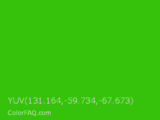 YUV 131.164,-59.734,-67.673 Color is a normal green color and the nearest color is Harlequin Green #46cb18. Hex code #36c20a and RGB value is rgb(54,194,10). In RGB color space, this color is composed of 21% red, 76% green, 4% blue, In CMYK color space, this color is composed of 72% cyan, 0% magenta, 95% yellow , 24% black , In HSL color space, this color has a hue angle of 106° , 90% saturation and 40% lightness.