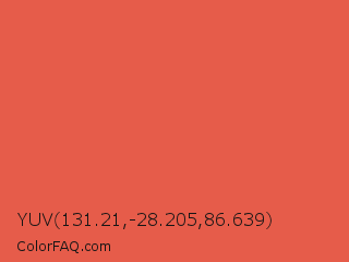 YUV 131.21,-28.205,86.639 Color is a normal red color and the nearest color is Jelly Bean #da614e. Hex code #e65c4a and RGB value is rgb(230,92,74). In RGB color space, this color is composed of 90% red, 36% green, 29% blue, In CMYK color space, this color is composed of 0% cyan, 60% magenta, 68% yellow , 10% black , In HSL color space, this color has a hue angle of 7° , 76% saturation and 60% lightness.