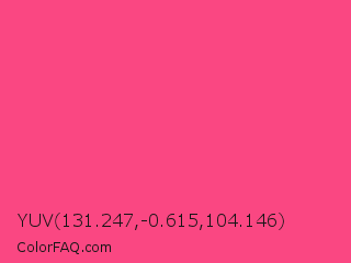 YUV 131.247,-0.615,104.146 Color is a light rose color and the nearest color is Sasquatch Socks #ff4681. Hex code #fa4782 and RGB value is rgb(250,71,130). In RGB color space, this color is composed of 98% red, 28% green, 51% blue, In CMYK color space, this color is composed of 0% cyan, 72% magenta, 48% yellow , 2% black , In HSL color space, this color has a hue angle of 340° , 95% saturation and 63% lightness.