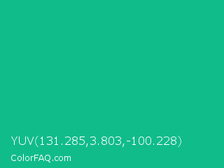 YUV 131.285,3.803,-100.228 Color is a normal green color and the nearest color is Mountain Meadow Crayola #1ab385. Hex code #11bc8b and RGB value is rgb(17,188,139). In RGB color space, this color is composed of 7% red, 74% green, 55% blue, In CMYK color space, this color is composed of 91% cyan, 0% magenta, 26% yellow , 26% black , In HSL color space, this color has a hue angle of 163° , 83% saturation and 40% lightness.