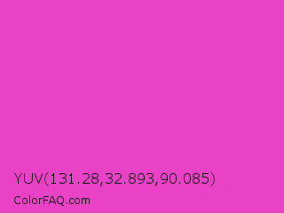 YUV 131.28,32.893,90.085 Color is a normal magenta color and the nearest color is Razzle Dazzle Rose #ff33cc. Hex code #ea42c6 and RGB value is rgb(234,66,198). In RGB color space, this color is composed of 92% red, 26% green, 78% blue, In CMYK color space, this color is composed of 0% cyan, 72% magenta, 15% yellow , 8% black , In HSL color space, this color has a hue angle of 313° , 80% saturation and 59% lightness.