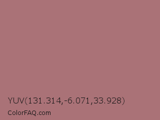 YUV 131.314,-6.071,33.928 Color is a normal red color and the nearest color is Burnished Brown #a17a74. Hex code #aa7277 and RGB value is rgb(170,114,119). In RGB color space, this color is composed of 67% red, 45% green, 47% blue, In CMYK color space, this color is composed of 0% cyan, 33% magenta, 30% yellow , 33% black , In HSL color space, this color has a hue angle of 355° , 25% saturation and 56% lightness.