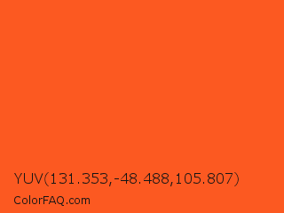 YUV 131.353,-48.488,105.807 Color is a normal color and the nearest color is Giants Orange #fe5a1d. Hex code #fc5921 and RGB value is rgb(252,89,33). In RGB color space, this color is composed of 99% red, 35% green, 13% blue, In CMYK color space, this color is composed of 0% cyan, 65% magenta, 87% yellow , 1% black , In HSL color space, this color has a hue angle of 15° , 97% saturation and 56% lightness.
