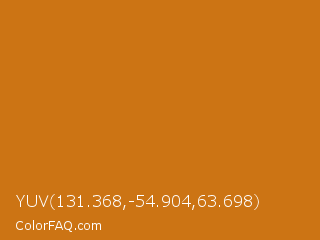 YUV 131.368,-54.904,63.698 Color is a normal orange color and the nearest color is Meteor #d07d12. Hex code #cc7414 and RGB value is rgb(204,116,20). In RGB color space, this color is composed of 80% red, 45% green, 8% blue, In CMYK color space, this color is composed of 0% cyan, 43% magenta, 90% yellow , 20% black , In HSL color space, this color has a hue angle of 31° , 82% saturation and 44% lightness.