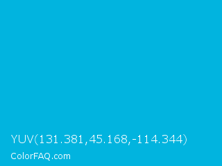 YUV 131.381,45.168,-114.344 Color is a normal cyan color and the nearest color is Cyan Process #00b7eb. Hex code #01b4df and RGB value is rgb(1,180,223). In RGB color space, this color is composed of 0% red, 71% green, 87% blue, In CMYK color space, this color is composed of 100% cyan, 19% magenta, 0% yellow , 13% black , In HSL color space, this color has a hue angle of 192° , 99% saturation and 44% lightness.