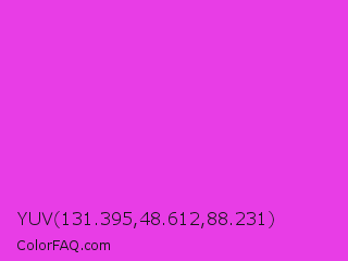 YUV 131.395,48.612,88.231 Color is a normal magenta color and the nearest color is Purple Pizzazz #fe4eda. Hex code #e83de6 and RGB value is rgb(232,61,230). In RGB color space, this color is composed of 91% red, 24% green, 90% blue, In CMYK color space, this color is composed of 0% cyan, 74% magenta, 1% yellow , 9% black , In HSL color space, this color has a hue angle of 301° , 79% saturation and 57% lightness.