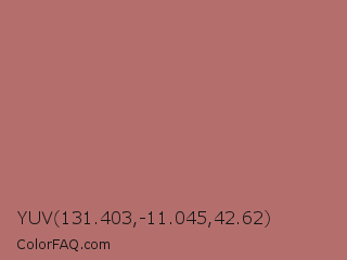 YUV 131.403,-11.045,42.62 Color is a normal red color and the nearest color is Copper Penny #ad6f69. Hex code #b46f6d and RGB value is rgb(180,111,109). In RGB color space, this color is composed of 71% red, 44% green, 43% blue, In CMYK color space, this color is composed of 0% cyan, 38% magenta, 39% yellow , 29% black , In HSL color space, this color has a hue angle of 2° , 32% saturation and 57% lightness.