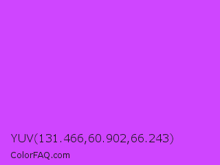 YUV 131.466,60.902,66.243 Color is a light purple color and the nearest color is Heliotrope #df73ff. Hex code #cf45ff and RGB value is rgb(207,69,255). In RGB color space, this color is composed of 81% red, 27% green, 100% blue, In CMYK color space, this color is composed of 19% cyan, 73% magenta, 0% yellow , 0% black , In HSL color space, this color has a hue angle of 285° , 100% saturation and 64% lightness.